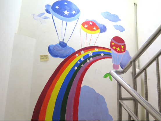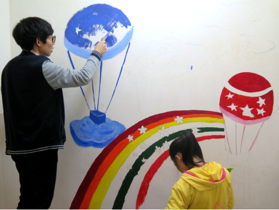 根据志愿者选择的图画,需要在两面不同的墙上绘制“长颈鹿”和“梦想的彩虹”两幅油漆画。志愿者别出心裁选择了“长颈鹿”这幅画是想在长颈鹿旁边绘画一个身高尺,让小朋友们随时能知道自己是否长高,并希望他们能够茁壮成长。而“梦想的彩虹”则是希望孩子们的梦想能像彩虹一般绚烂。