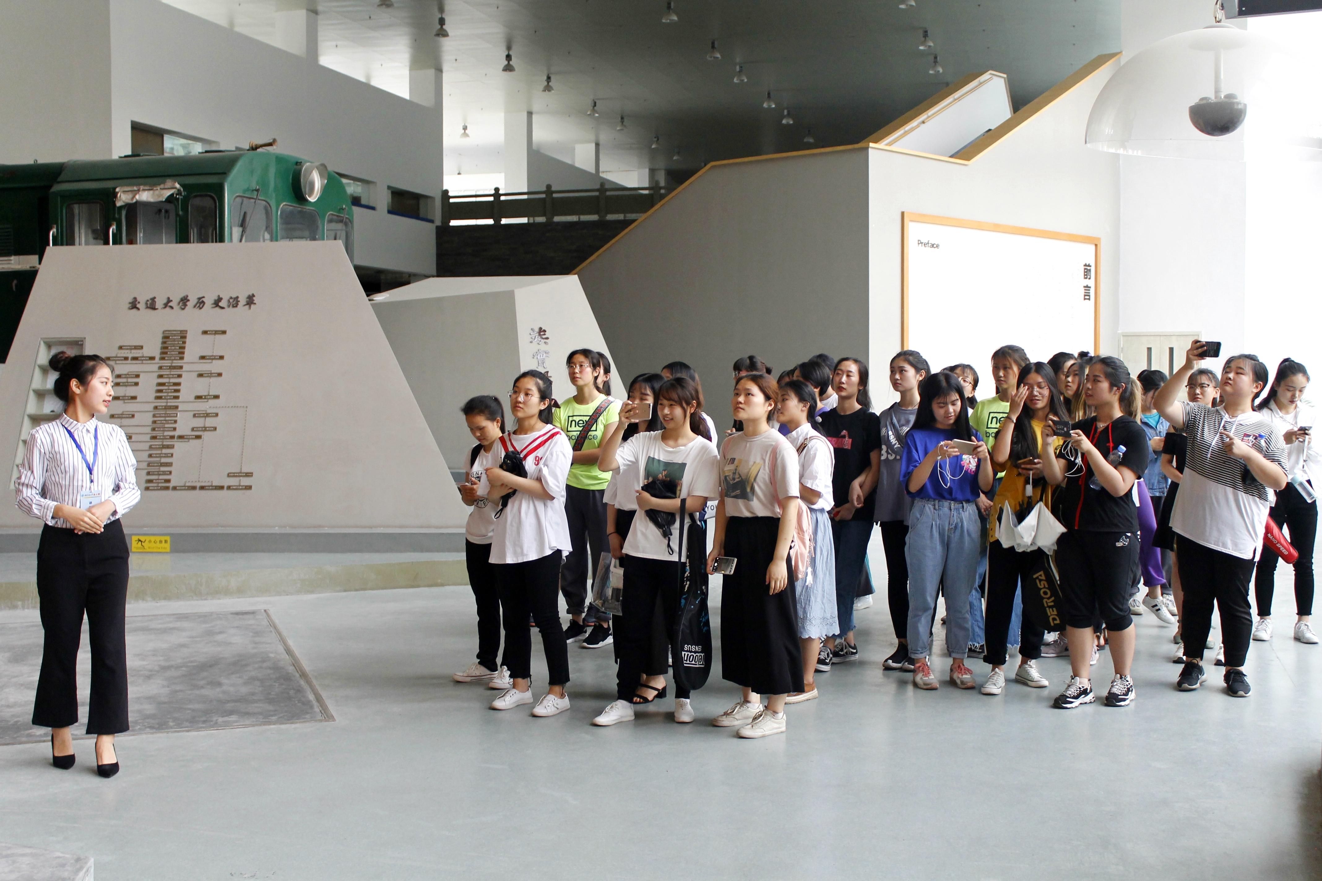 首先,公司一、二年级同学在校史馆讲解员的带领下井然有序进入校史馆进行参观。讲解员先后介绍了东方红21型内燃机车、公司迁徙史、交大校徽的四个部分代表的不同的交大精神。随后,讲解员结合展板内容和馆内陈列物品向大家介绍了公司的相关历史情况。