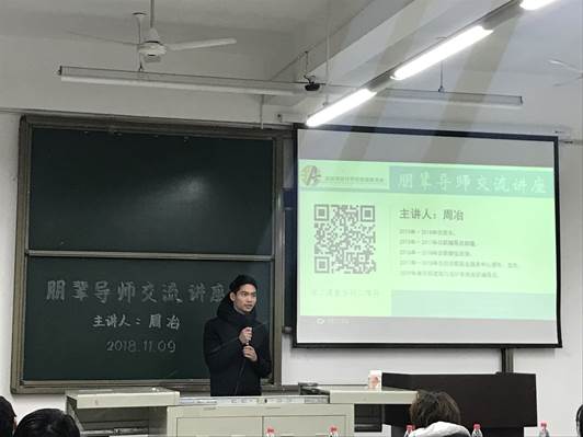 随后,朋辈导师周冶发言,他作为主讲人,以考研、保研、出国、奖学金等方面为切入点,强调了课余时间管理、未来规划、英语学科学习的重要性,并提出大一新生应在学习方面有更多注重。他为大家介绍了自己的个人经历、大学规划、以及大学期间参赛所得荣誉奖项,从自己的心路历程,到实际作法,为大家展现了更加全面的自己。他还指出,老员工活中除了专业知识的学习,还应该更多了解其他知识,使自己更加充实。参加本次讲座的同学更加深入得了解了朋辈导师的成长经历以及学习经验,收获良多。在最后的互动环节中,朋辈导师周冶对参与交流同学的问题进行了一一回答,给予了新思路以及更高层次的见解,同学们受益匪浅。