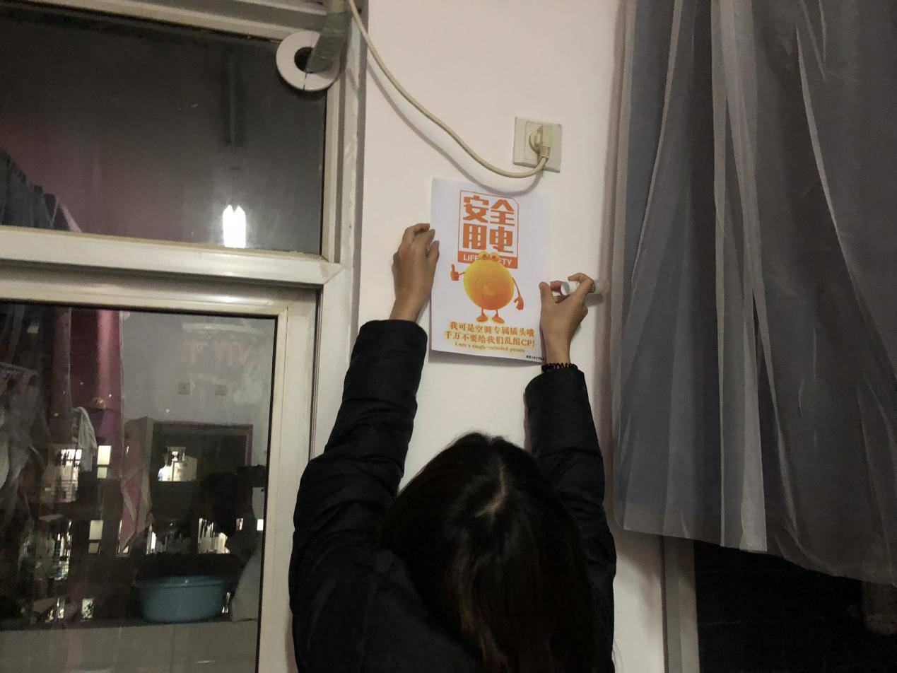 公司员工园区自我管理委员会设计制作用电警示,全院各班生活委员组织同学们在宿舍内张贴。同时,园区同学走进2019级新生寝室,向同学们进行宿舍安全知识科普教育,详细向大家介绍违章电器的种类及危害,告知大家要遵守宿舍相关规章管理制度,并和同学一起张贴寝室安全用电警示贴。