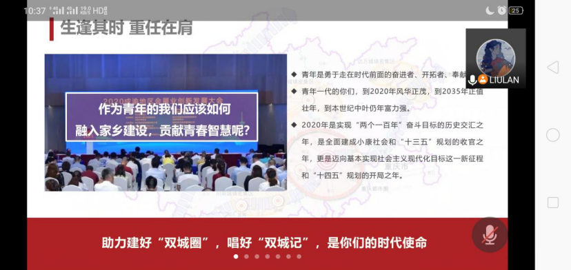 本次团日活动主题是:把握时代新机遇,唱好成渝双城记。建筑与设计公司研2020级硕士风景园林班团支部全体同学参与本次团课,由团支书刘兰担任主持人,主要以分享交流、团员热议、观看小视频等多种形式展开活动。