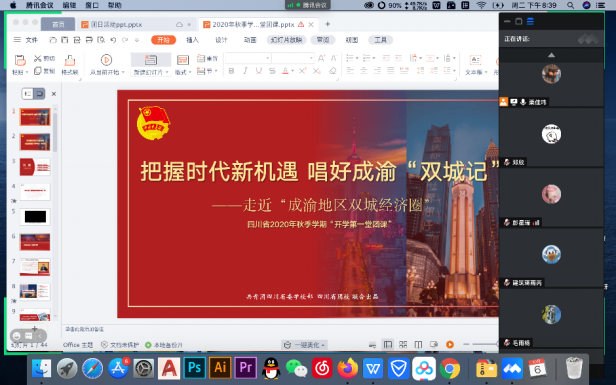 活动在全班齐唱团歌声中拉开帷幕。首先,班长陈卓哲为全体同学朗读了«团团致四川学子的一封信»。在主持人带领下,全体同学学习了«带你走进“成渝地区双城经济圈”»团课PPT,从“成渝新启航,构建新格局”“打造新高地,共赢新发展”“把握新机遇,建功新时代”三个主要部分,通过文字、图形、数据与视频相结合的方式生动形象地给研2020级建筑学学硕班团支部的同学们进行了详细介绍。最后,主持人带领全体同学发出了“‘我为成渝代言’共同为我们的家乡贡献自己的青春力量”的呼吁。接着,