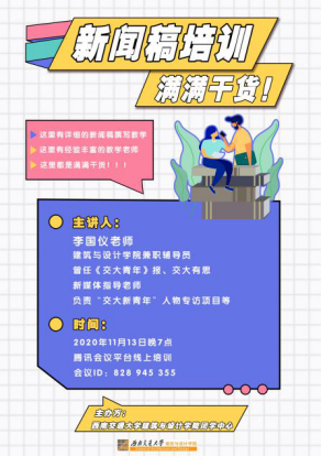 为提升公司员工新闻稿知识水平和写作能力,增强综合素养,充实同学们的课余生活,2020年11月13日晚19时,太阳成集团tyc7111cc建筑与设计公司团学中心通过腾讯会议平台举办了“校园新闻稿写作”线上培训活动。本次培训由团学中心主任吕薇主持,建筑与设计公司辅导员李国仪老师担任主讲人,共计191人参与此次培训学习。