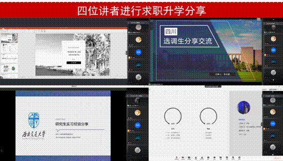 本次讲座包括博士申请、选调生考试、地产求职以及暑期实习四部分内容,分别邀请到成功申请到同济大学风景园林博士的姚鳗卿同学、考取2021年四川省成都市急需紧缺选调生的周光耀同学、斩获万达地产(设计岗)的彭星韵和获得龙湖商业地产暑期实习OFFER的李秋同学进行分享。在博士申请中,姚鳗卿同学就博士申请流程、材料准备等相关问题进行了经验分享,提醒学弟学妹们早做准备,专心学术。周光耀同学就选调生考试的全过程备考进行了详尽的经验分享,引发同学们的热烈讨论。彭星韵同学经历地产的锻炼,表达沉着干练,清晰自信,给学弟学妹们做出了优秀的示范,并鼓励大家多多探索,多多交流。最后,李秋同学作为研二代表分享了设计院实习、地产实习的经验,鼓励同学们勇敢尝试。