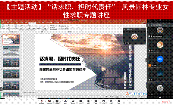 为了进一步提高风景园林专业研究生升学求职的质量,2021年6月10日,研风景园林党支部携研2019级、2020级风景园林团支部共同组织了“承红色基因感党恩,扬专业之长践使命”主题系列教育第四次活动“话求职,担时代责任” 风景园林专业女性求职专题讲座,本次讲座邀请了建筑与设计公司辅导员戎尚老师和成飞老师,讲座由陈莹莹同志主持。