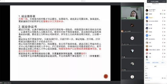 大会伊始,杨珂老师结合网络信息材料向同学们展示了就业推荐表和就业协议书并对填写流程逐条进行详细介绍。杨珂老师表示同学们要慎重核对签约单位名称及代码、户口、档案等相关信息,特别强调了同学们应该严格遵守就业协议签订过程中的相关规定。随后,针对同学们的就业去向和人才落户,杨珂老师详细介绍了派遣信息填写和档案转接流程,提醒大家细心面对,多与相关单位进行沟通了解相关政策,不要恐慌,对自己的未来负责。