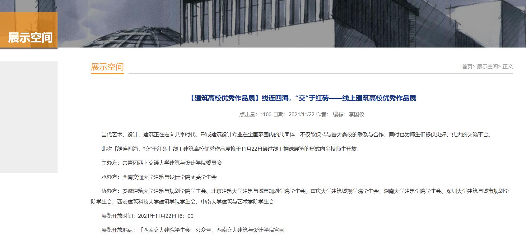 下午16时20分,建筑与设计公司团委书记孔翔榆老师宣布本次线连四海,“交”于红砖——建筑高校优秀作品展正式开始,建筑与设计公司团委员工会官方公众号平台、建筑与设计公司官网同步上线展览。