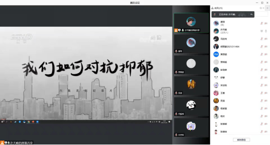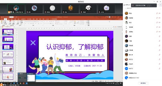 为了普及心理知识,营造班级良好氛围。2021年11月24日下午2:30建筑与设计公司2021级建筑专硕1班因受疫情影响,通过腾讯会议采用线上举办主题班会活动。同时为响应公司心理中心和学工部的号召,一场旨在了解研究生的心理变化,做好研究生心理健康教育工作,同时为了引导号召大家关注自身健康,正视自身问题,开展“认识抑郁、了解抑郁,善待自己、关爱他人”主题活动。