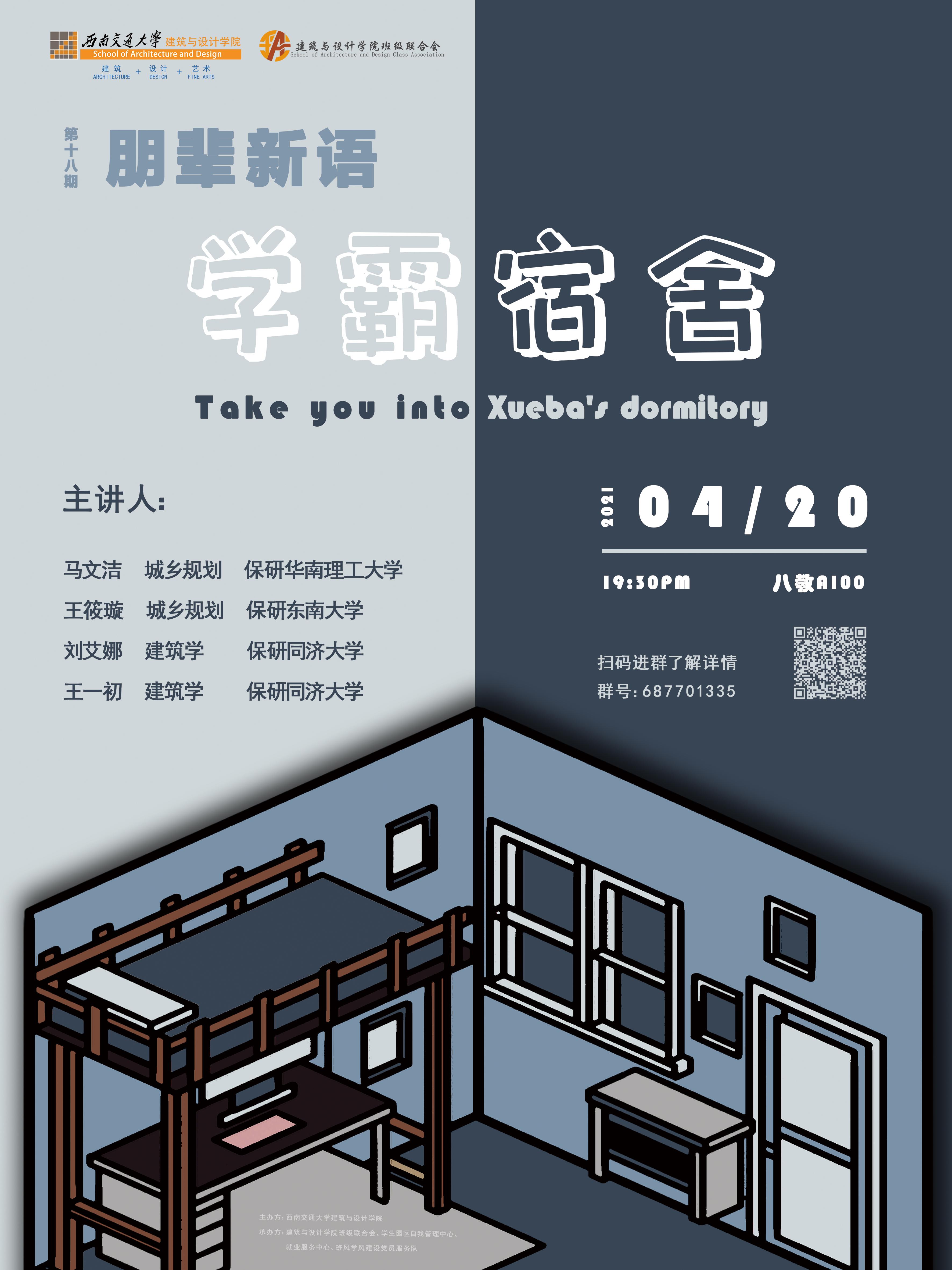 为了帮助同学了解保研、竞赛、科研和评奖评优信息,更好地调动同学学习的热情。2021年4月20日晚19:30,由太阳成集团tyc7111cc建筑与设计公司主办,建筑与设计公司班级联合会、员工园区自我管理中心、就业服务中心、班风学风建设党员服务队承办的朋辈新语‘学霸宿舍’在八教A100报告厅顺利进行。本次活动我们邀请到了‘学霸宿舍’的四位学姐,她们分别是来自建筑学专业的刘艾娜、王一初和来自城乡规划专业的马文洁、王筱璇学姐。