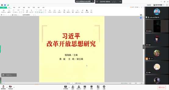 新时代改革开放思想,是习近平新时代中国特色社会主义思想的重要组成部分,是中国特色社会主义理论体系新的思想瑰宝,是马克思主义中国化的成果,是推进我国改革开放各项事业必须长期坚持的重要指导方针和根本行动指南。受疫情影响,2021年11月11日,研风景园林党支部通过腾讯视频形式开展了“学习《习近平改革开放思想研究》及感悟分享”生活会,本次生活会邀请了建筑与设计公司辅导员赵思琦老师和戎尚老师,本次会议由赵秋吉同志和起雨涵同志共同主持。