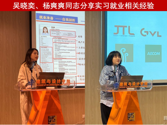 首先由吴晓奕同志分享了就业相关经验,详细讲解了各个专业方向的求职流程,建议就业要从自身情况出发,了解自己兴趣方向,并做针对性的准备,更能增加获得心仪工作的机会。杨爽爽同志分享了实习相关经验,重点强调了个人作品集制作的重要性,并表示不要盲目相信网上“劝退”话语,风景园林专业值得热爱与专注。