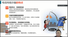 在“什么是网络诈骗”这一部分当中,赵警官指出,电信诈骗是指通过电话、网络和短信方式,编造虚假信息,设置骗局,对受害人实施远程、非接触式诈骗,诱使受害人打款或转账的犯罪行为,通常以冒充他人及仿冒、伪造各种合法外衣和形式的方式达到欺骗的目的,如冒充公检法、商家公司厂家、国家机关工作人员、银行工作人员等各类机构工作人员,伪造和冒充招工、刷单、贷款、手机定位和招嫖等形式进行诈骗。随后,赵警官向大家远程展示了网络诈骗的三个特征:无法确认身份、见不到真人、汇款转账。赵警官提醒我们,要防范于未然,切记不要轻易深信任何陌生短信以及电话,察觉到不对的情况一定要及时报警,避免重大经济财产的损失。