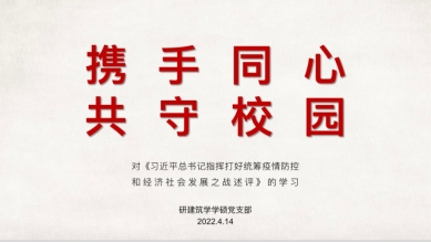 分享结束后,赵夺同志号召研建筑学学硕党支部的全体同志们要统一思想、提高认识、坚定信心、积极配合、克难攻坚,凝聚起同心战疫的强大合力,坚决打赢疫情防控这场大仗硬仗!