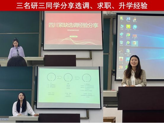 会议伊始,杨珂老师对整个年级的就业形势进行了分析,并重点分析了风景园林专业的就业形势,对进行分享的各位同学表示了感谢与祝贺,紧接着考取了2022年四川省紧缺选调生的邓舒曼同学、获得成都设计咨询集团OFFER的张弘毅同学和成功申请到同济大学风景园林博士的陈莹莹同学进行分享。邓舒曼同学就选调生考试的备考过程进行了详尽的经验分享,并总结了近几年选调情况,引发了同学们的积极提问与交流。张弘毅同学根据重要求职时间节点提醒同学们提前做好充足的准备,制作相对应的简历,并鼓励大家不要害怕失败,调整好心态,一定能取得满意的结果。对于博士的申请过程,陈莹莹同学就时间安排、材料准备等相关方面进行了经验分享,着重向我们介绍了博士申请过程中的笔试和面试情况,建议提前联系目标公司的导师。