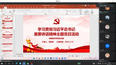 为不断提高党员同志自身综合素质,助力员工党支部建设。2022年5月19日,研建筑学学硕党支部召开线上组织生活会,开展“主题党日——学习贯彻习近平总书记重要讲话精神”活动。活动由党支部赵夺同志主持,支部党员、预备党员及部分入党积极分子参与。