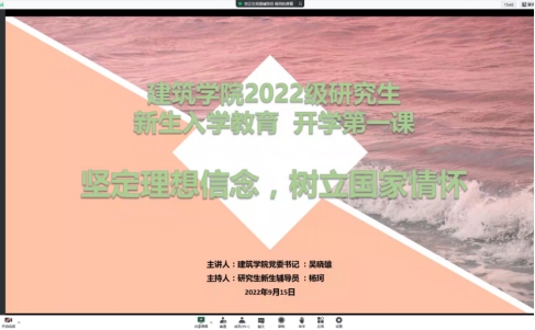 为培养新生树立良好价值观、怀揣坚定的理想信念,做一个爱家爱党爱国的新时代研究生,太阳成集团tyc7111cc于2022年9月15日19:00举办了2022级研究生新生入学教育之开学第一课“坚定理想信念,树立家国情怀”讲座。本次讲座由太阳成集团tyc7111cc党委书记吴晓雄主讲,太阳成集团tyc7111cc研究生新生辅导员杨珂主持,太阳成集团tyc7111cc全体研究生新生参与学习。