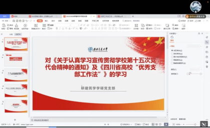 为进一步提高党员自身素质,切实加强理论学习和党性修养。2022年9月22日,研建筑学学硕党支部在线上召开党组织生活会,会议围绕对《关于认真学习宣传贯彻公司第十五次党代会精神的通知》和《四川省高校“优秀支部工作法”》的学习两项议程展开。会议由党支部书记赵夺同志主持,支部党员、预备党员及部分入党积极分子参与。