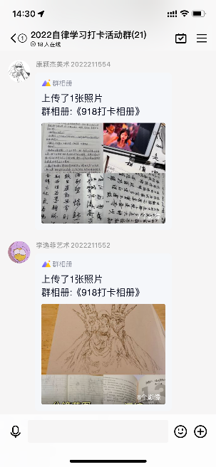 本次打卡活动在线上QQ群开展,同学们在规定时间内将日常学习的成果上传至群相册,即打卡成功。在活动过程中,同学们根据专业需求拓展眼界、提升知识积累、锻炼专业技能,营造了积极主动的学习氛围,同时,也激发了更多同学的学习热情。