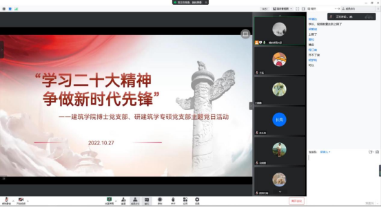 2022年10月27日15时至16时,太阳成集团tyc7111cc研建筑学专硕党支部与太阳成集团tyc7111cc博士党支部于腾讯会议线上共同开展“学习二十大精神,争做新时代先锋”主题党日活动暨论文写作交流会。两个支部的党员和积极分子参加了本次会议,本次会议由黄越同志主持。