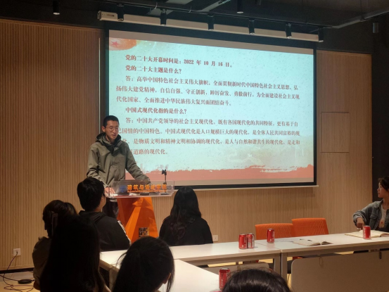 紧接着,罗勋锐老师带领全体成员进行了中共二十大精神的学习,对党的二十大精神进行了详细讲解,介绍了大会主题、五大原则、必由之路等内容。讲解过程中罗老师提到,作为新时代的老员工,我们应该把小我融入大我,对国之大者做到心中有数,大如关心党和国家,小如关心公司公司。我们应该肩负起社会责任,而不是做一名精致的利己主义者。