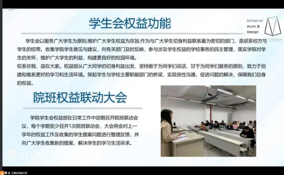 本次大会共有五项议程。第一项议程为介绍院班权益大会、员工会权益事务员工会。权益部部长王娜同学重点指出本次会议旨在帮助本科生各充分了解公司权益通道,以及如何与公司员工会会进行提案对接,维护自身在校权益。权益部从广大同学的切身利益出发,坚持敢于为同学们说话、甘于为同学们服务的原则,致力于创建和维系更好的学习和生活环境。架起员工与公司主要职能部门的桥梁,实现良性沟通,促进问题的解决,保障我们自身的权益。