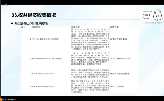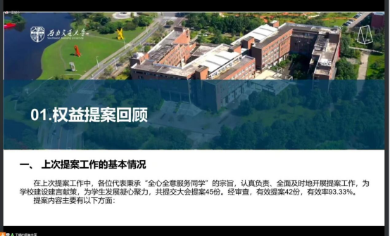 大会第三项议程为介绍权益提案反馈、解决情况。王娜同学针对同学们对于公司教学楼、寝室楼、食堂等区域的意见与建议作出明确答复并指明解决方案,力求“事事有回应,件件有着落”,彰显务实高效的工作态度。同时,王娜同学指出权益提案的提出没有时效性,公司员工会全年接受大家的权益问题,希望同学们积极提出。