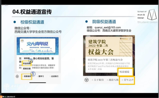 大会第四项议程为宣传权益通道。王娜同学向大家介绍如何通过校级、院级权益通道提交权益诉求,以及公司各生活服务中心、后勤保障中心的联系方式,希望同学们在日常学习生活中遇到的问题都能得到妥善高效的处理。
