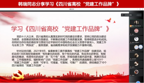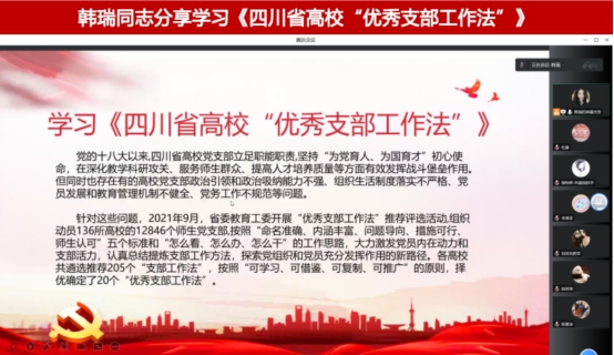 会议第二部分由韩瑞同志带领全体党员深入学习《四川省高校“优秀支部工作法”》《四川省高校“党建品牌”》,以优秀案例作为学习典范,另外重点介绍了本校牵引动力国家重点实验室列车与线路研究所党支部的“三抓三筑三提升”工作法,鼓励大家进一步开拓思路,创建和提炼更多富有公司特色、师生群众广泛认可的公司“党建工作品牌”“党支部工作法”。