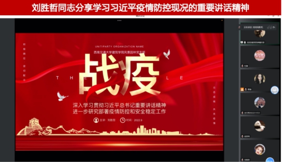 会议伊始,刘胜哲同志带领党员同志们一同学习习近平总书记关于疫情防控现况的重要讲话精神,随后,向大家展示了本轮成都疫情防控中所涌现的交大力量,全校共产党员、干部走在前线做表率,积极投身疫情防控工作,更加激励广大党员迎难而上,树立先锋模范作用。同时刘胜哲同志也介绍了疫情管控期间校园管理规章制度以及后续工作安排,他表示,作为青年老员工党员,更应以身作则,引导同学们积极配合相关工作。最后,他带领全体同学观看了《共同守护深爱的成都》短视频,告诉广大同志疫情防控面前无小事,抗疫人人有责。