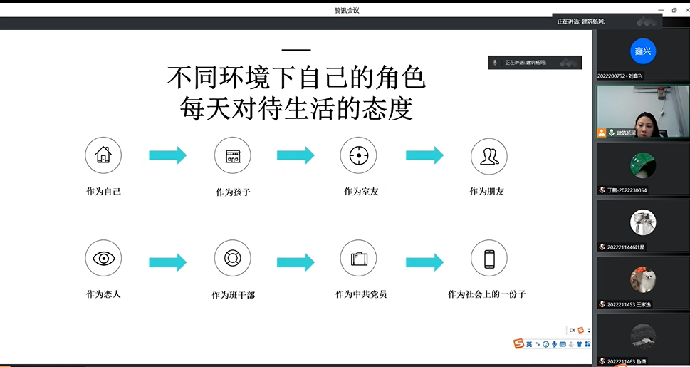 随后杨珂老师分别员工应该如何看待自己的角度出发,提出了研究生作为自己,应该对生活的负责,始终以积极的态度面对生活;作为孩子,应该善待父母,主动承担家庭的责任;作为室友,应该珍惜短暂的相遇;作为朋友,应该互相帮扶;作为恋人,应该具有责任感,朝着良性的方向发展;作为班干部,以身作则,团结同学;作为中共党员,紧密向组织靠拢,常要进行自我反思;作为社会上的一份子,应该努力提升自我价值”。