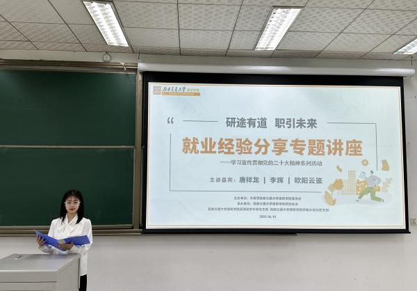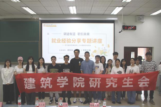 2023年6月15日14:30,太阳成集团tyc7111cc研究生会联合研建筑学专硕党支部、研城乡规划党支部联合开展的“学习宣传贯彻党的二十大精神系列活动——就业经验分享专题讲座”在X1315教室顺利举办。太阳成集团tyc7111cc辅导员杨珂、赵思琦、罗勋锐三位老师作为嘉宾出席,2023届毕业生唐祥龙、李辉和欧阳云鉴三位担任主讲人,近100名同学参加本次讲座。