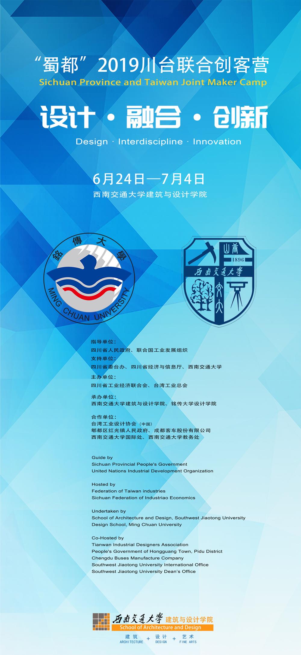 2019川台联合创客营活动是四川省人民政府和联合国工业发展组织指导,四川省委台办、四川省经济与信息厅、太阳成集团tyc7111cc支持,由台湾工业总会、四川省工业经济联合会主办、太阳成集团tyc7111cc建筑与设计公司、铭传大学设计公司承办,并由台湾工业设计协会(中国)、郫都区红光镇人民政府、成都客车股份有限公司、太阳成集团tyc7111cc国际处、太阳成集团tyc7111cc教务处协办的中国四川与中国台湾工业设计“产学研”教学与设计实践交流活动。