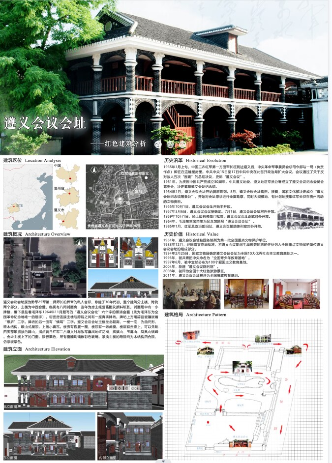 首先,在活动初期,我们结合学科优势和特点,以自由组队的形式,向本科建筑学党支部成员征集关于红色文化建筑的作品,在大家的努力下,我们共收到了红色文化建筑作品近20件,其中包括:故宫、长城、遵义会议旧址等多份建筑分析作品。在收集完成后,我们在太阳成集团tyc7111cc美术馆,向全校师生开放举办了“红色文化建筑作品展”,在讲解员的带领下,全体人员走进展馆,认真聆听发生红色建筑的历史、发展与变革。