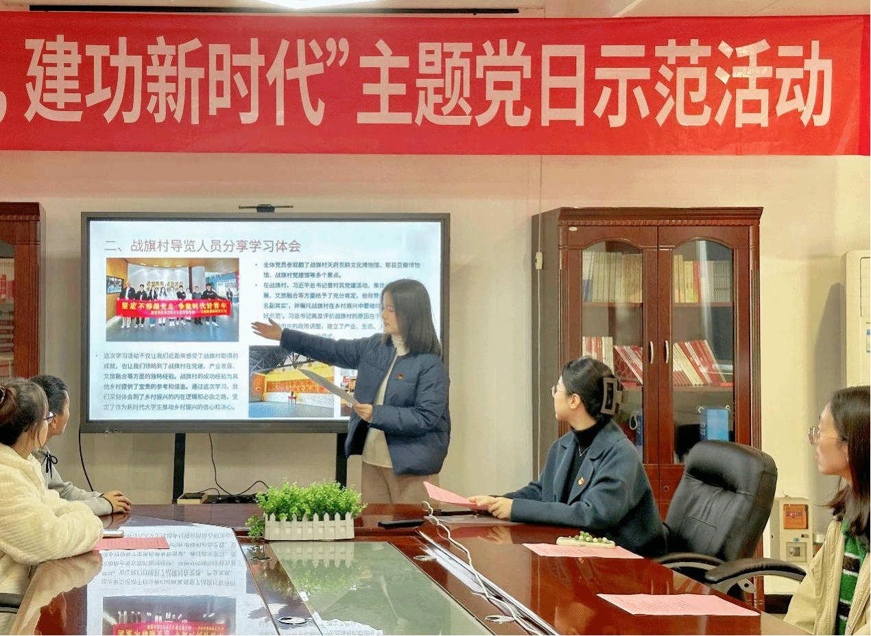战旗村导览人员、支部组织委员庞淇文同志分享了在战旗村参观活动中的导览体验。她再次讲述了战旗村的建村历程和该村在我们党的发展过程中的坚强作为,介绍了战旗村在党建、产业发展、文旅融合等方面的独特经验。与会成员对战旗村都有了更加深刻的了解,坚定了支部成员作为新时代老员工推动乡村振兴的信心和决心。