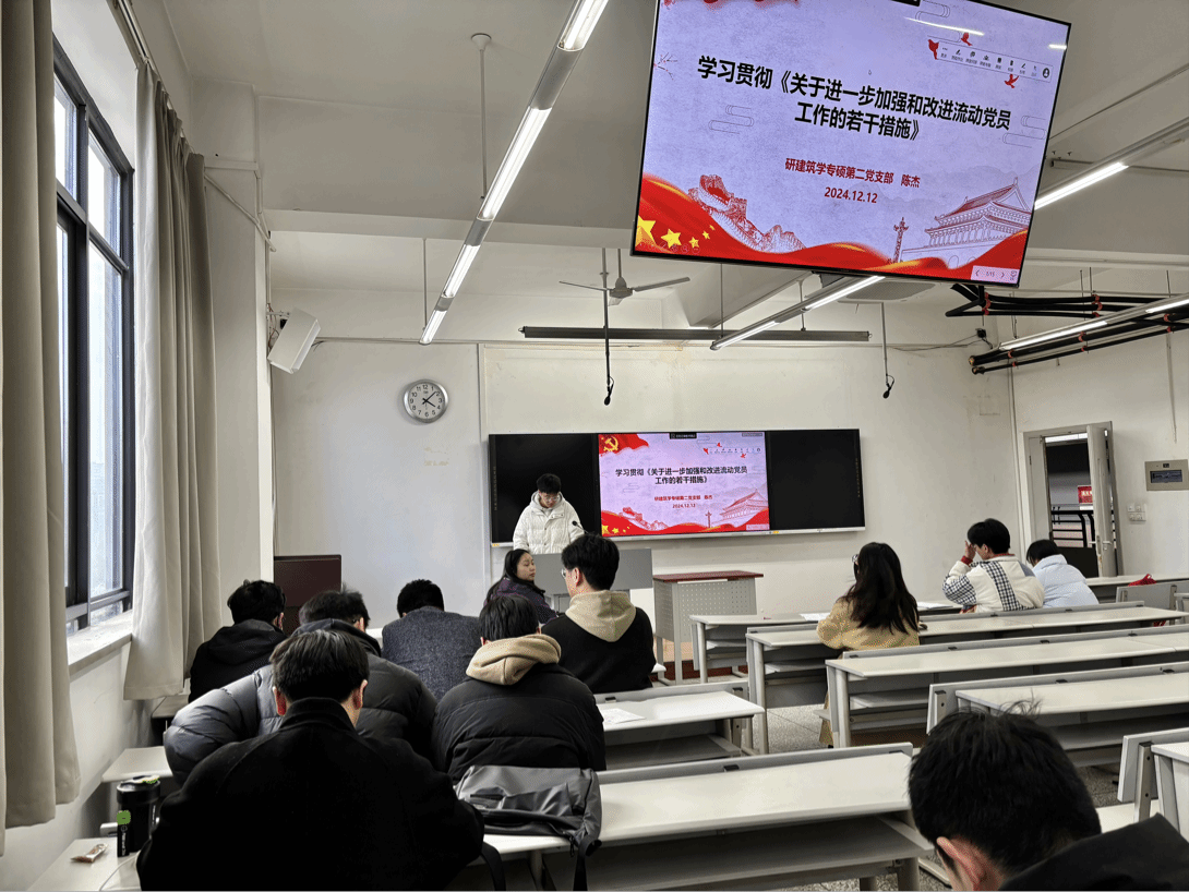 为深入学习贯彻党的二十届三中全会精神,学习习近平主席关于共建“一带一路”的重要讲话精神,领会新时代马克思主义理论研究和建设工程的重要指示。2024年12月12日16时至17时,研建筑学专硕第二党支部在X8521开展了“学习贯彻党的二十届三中全会精神”的主题党日活动。本次活动由党支部联系人杨忻睿同志主持,支部全体党员和积极分子参与了本次党日活动。