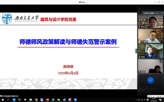 6月4日,工业设计系党支部和风景园林系党支部,联合组织了本周的政治理论学习。本次学习通过在线会议方式进行。公司党委吴晓雄书记参加了本次学习,为两系全体教师做了题为《师德师风政策解读与师德失范警示案例》的主题学习报告。吴书记深度解读了党中央、教育部关于师德师风的各项政策,深入介绍了公司关于师德师风建设的各项规定,结合实际案例,生动分析了师德失范的典型表现,帮助老师们更加深刻地理解恪守师德师风应坚守的界限,勉励老师们积极追求卓越,保持清醒理性,模范践行教师行为准则,做员工的良师益友。