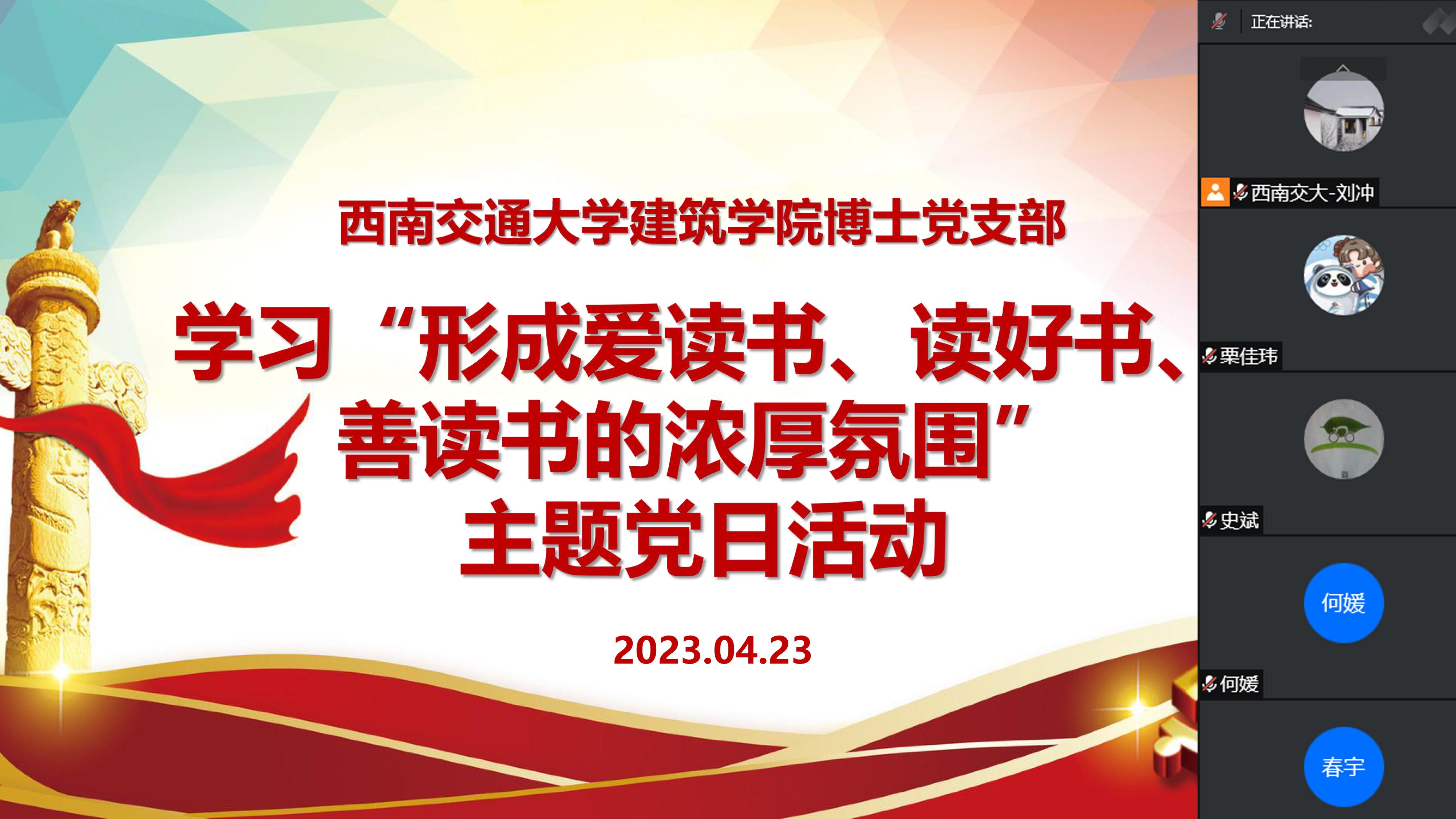2023年4月23日下午3点,公司博士党支部采用线上腾讯会议的方式组织学习“形成爱读书、读好书、善读书的浓厚氛围”主题党日活动。