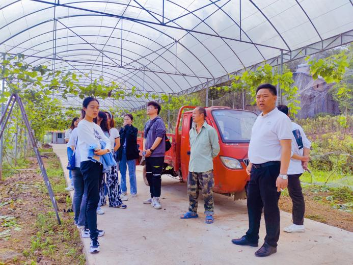 座谈结束后,同志们在村书记袁世超的带领下对尊恭村展开更深入的调研,分别对村里的四社居民安置点、活动广场、生态葡萄园、齐民要术草莓、生态耙耙柑及西门塔尔牛养殖场等进行实地调研,其中西门塔尔牛养殖场是尊恭村特色生态农产品产业链关键核心项目,由村集体经济合作社、村民、新希望等多方共同合作经营,村民可以自愿入股,坚持“以牛入股,按股分红”和“风险共担,利益共存”的发展理念,尽可能降低村民的风险、提高村民收益。通过现场踏勘,大家更具体地了解到村里的人居环境和产业经济发展现状、发展诉求和发展愿景。