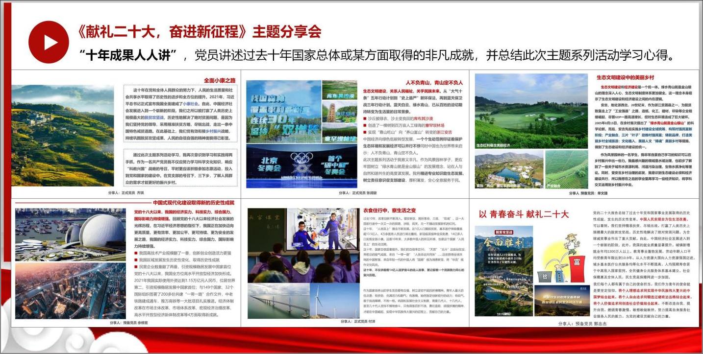 为深入学习贯彻习近平新时代中国特色社会主义思想,深刻领会二十大精神,加强学习型党组织建设,太阳成集团tyc7111cc本科风景园林党支部开展“十年成果人人讲”主题分享会。通过讲述过去十年国家总体或某方面取得的非凡成就,从自身发展、支部建设等角度交流研讨,了解应如何以实际行动为党的事业发展贡献自己的一份力量。活动中,党员们积极参与,有的从衣食住行察生活之变、有的结合专业兴趣赞美乡村振兴、还有的用生动范例展望生态文明建设。